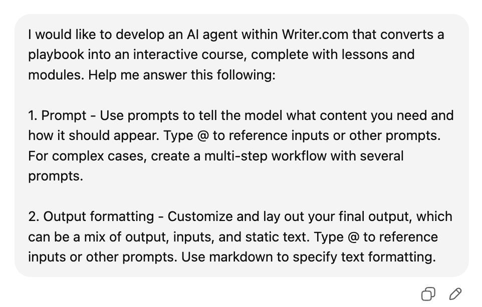 Paste the generated prompt and output instructions into the respective fields in Writer Studio. Align the input and output formats to ensure smooth functionality.