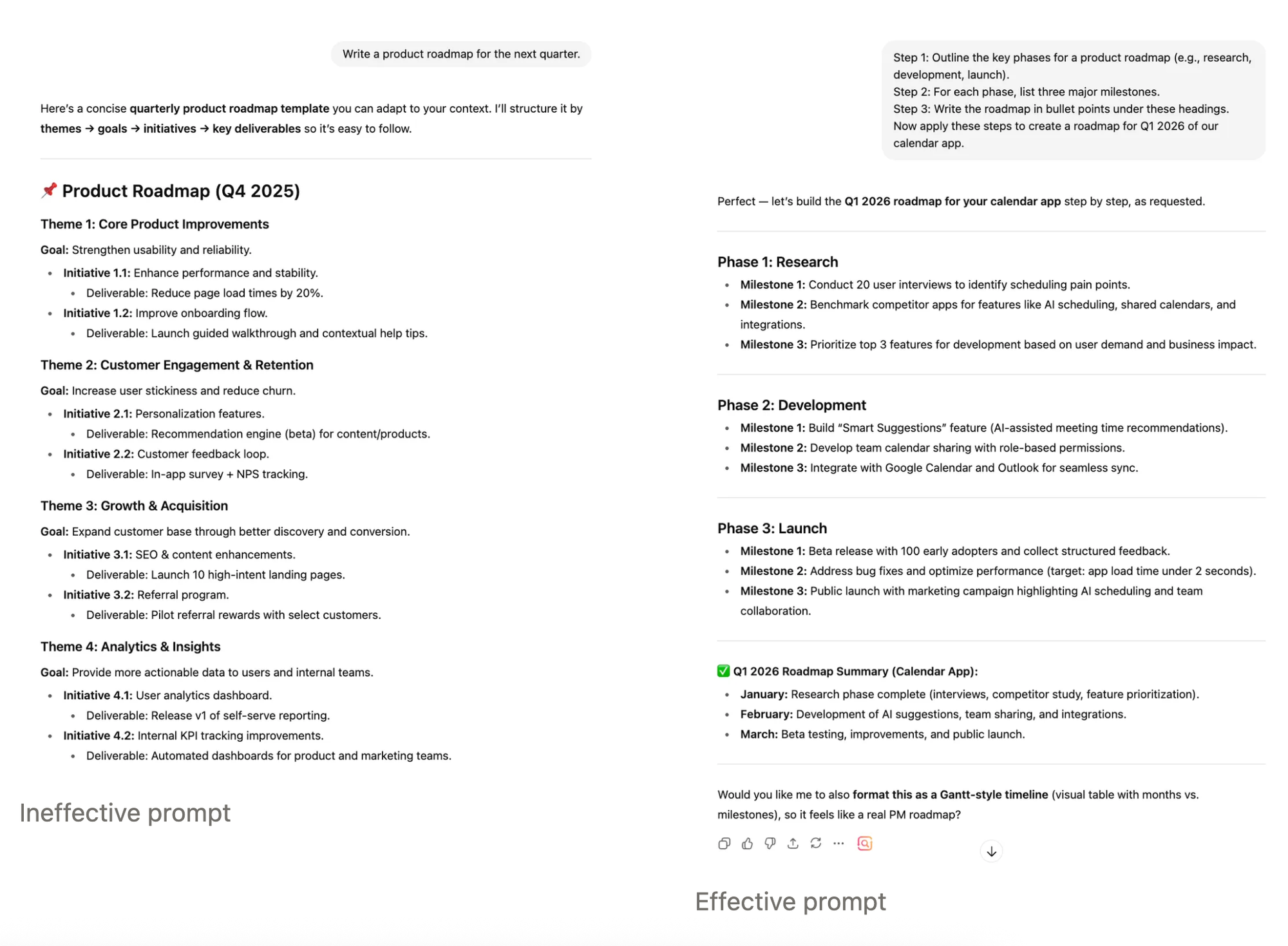 Why it fails: Without examples or structure, the AI’s output is likely to be vague or misaligned with your needs.
